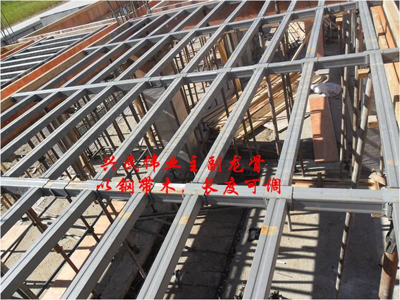 新型的建筑模板支撐架的頂、梁、柱、墻模板主副龍骨不用木方,采用C型冷軋鋼,厚度為2.0-2.5mm,熱鍍鋅。根據(jù)施工空間尺寸,可以自由伸縮,主龍骨按搭建方案中設(shè)計(jì)的布局鋪設(shè),副龍骨按300MM的間距放置在主龍骨上即可。鋼龍骨可以循環(huán)使用300多次。